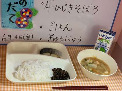 6月14日(金)の給食は、『ごはん、牛乳、さごしの塩焼き、みそ汁、牛ひじきそぼろ』でした。