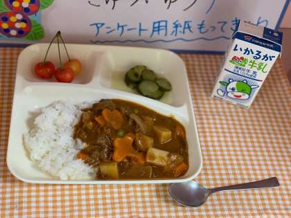 今日の給食は『ハヤシライス、きゅうりのサラダ、さくらんぼ、牛乳』でした。