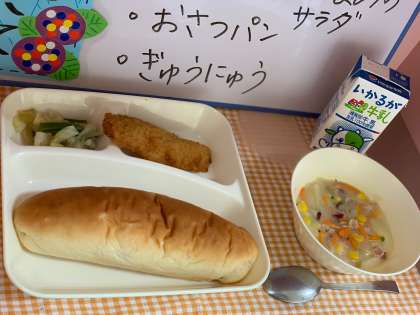 今日の給食は『おさつパン、牛乳、サーモンフライ、豆乳スープ、キャベツとさんどまめのサラダ』でした。