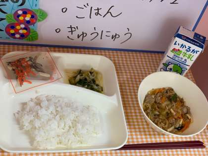 「マーボーはるさめ」は、牛ひき肉・豚ひき肉、はるさめを主材に、にんじん、たけのこ、たまねぎ、干ししいたけ、にらなどたくさんの野菜を使用した、児童に好評な献立です。