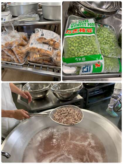 「豚肉といかの煮もの」は、豚肉・いかを主材に、じゃがいも・あつあげ・たまねぎを使用した煮ものです。青みに冷凍のむきえだまめを加え、彩りよく仕上げています。