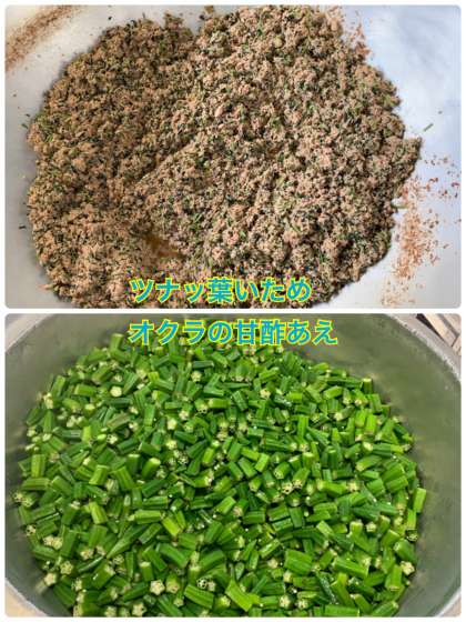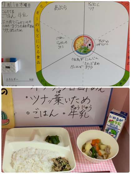 今日の給食は『ごはん、牛乳、豚肉とじゃがいもの煮もの、オクラの甘酢あえ、ツナっ葉いため』でした。