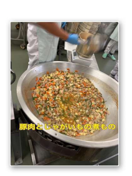 豚肉を主材に、じゃがいも・たまねぎ・にんじん・つなこんにゃくを使用した煮ものです。青みにさんどまめ(冷凍のもの)を使っています。