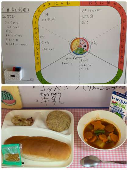 7月16日(火)の給食は、『コッペパン、牛乳、チキンレバーカツ、ケチャップ煮、たことキャベツのソテー、りんごジャム』でした。