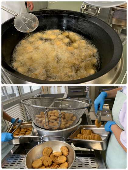 児童に人気のある「チキンレバーカツ」は、ほんのりカレー味で食べやすく、鶏肉のレバーを加えることで、不足しがちな鉄分を摂ることが出来ます。