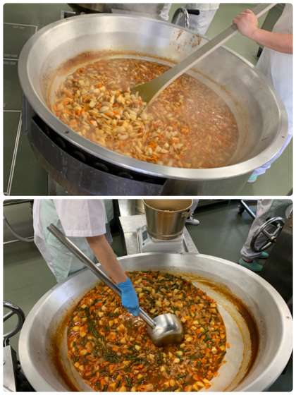 「ケチャップ煮」は、豚肉を主材に、じゃがいも・たまねぎ・にんじん・さんどまめ・トマト(缶)を使用し、とんかつソースやケチャップで味付けした洋風の煮ものです。