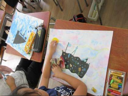 描く前に、船の名前や船に乗ってどこに行こうかなどの物語を考えると、子どもたちは完成させるのを楽しみにしていました。
