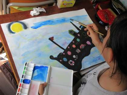 最初に、画用紙の上で水に乗せた絵の具をにじませる「たらしこみ」という技法を使って海の背景を描きました。
