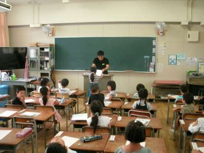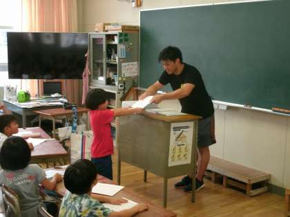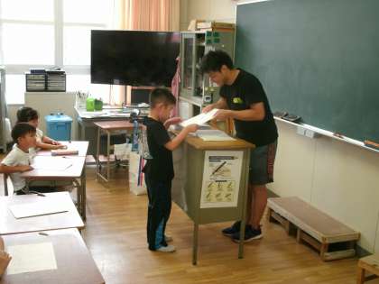 2時間目に1年生は小学校生活、初めての通知表を受け取りました。こちらは1年1組の様子です。担任の先生から一学期がんばっていたことを一人一人言ってもらいながら受け取っていました。子どもたちはとてもうれしそうでした。