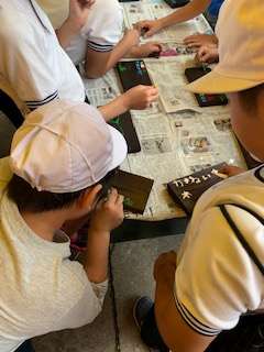 焼き板に絵付けをしています。
