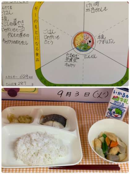 今日の給食は、『ごはん、牛乳、さごしの塩焼き、じゃがいもと一口がんもの煮もの、キャベツのおひたし』でした。