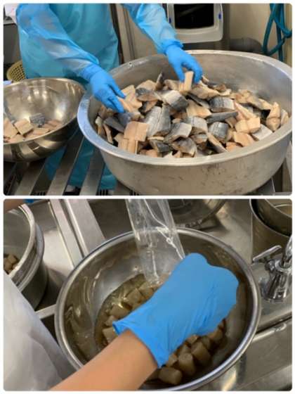 今日は料理酒と塩のみで下味をつけたさごしを、スチームコンベクションオーブンで蒸し焼きにしています。