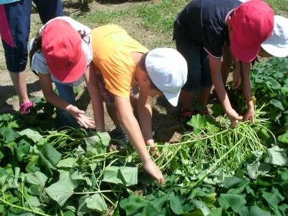 2年生が学習園で育てているサツマイモの「つる返し」をしました。
