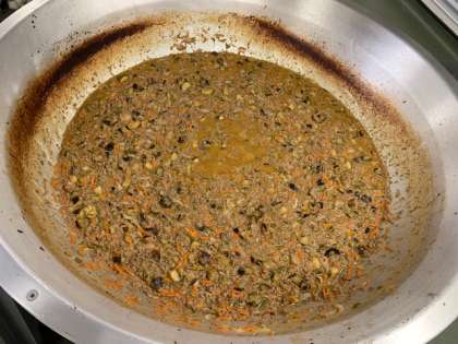 「マーボーなす」は牛・豚のひき肉を主材に、旬のなすを使用した、児童に好評な献立です。新森小路小学校では今日、約31kgのひき肉と約25kgのなすを使用しました。