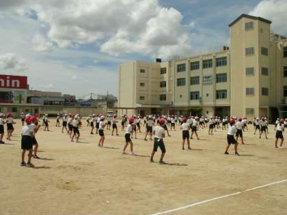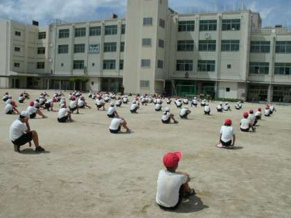 途中、大阪880万人訓練があり、運動場で地震に遭ったときを想定して、建物から離れたところで座りました。また、津波のときは校舎の高いところに避難することもお話しています。