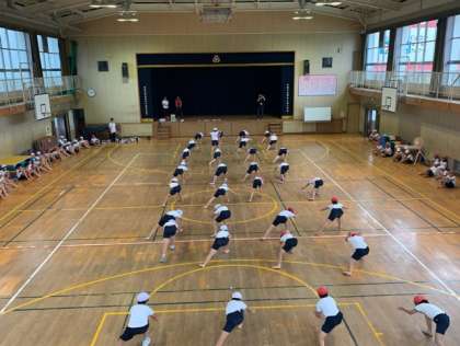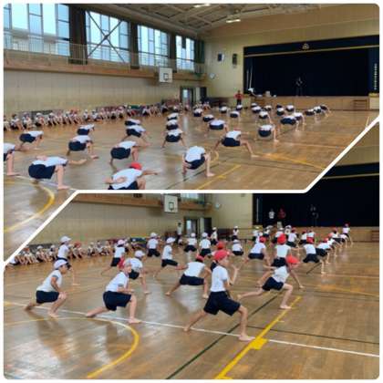 5時間目は運動場で隊形移動の練習を行い、6時間目は体育館でクラスごとに披露しました。