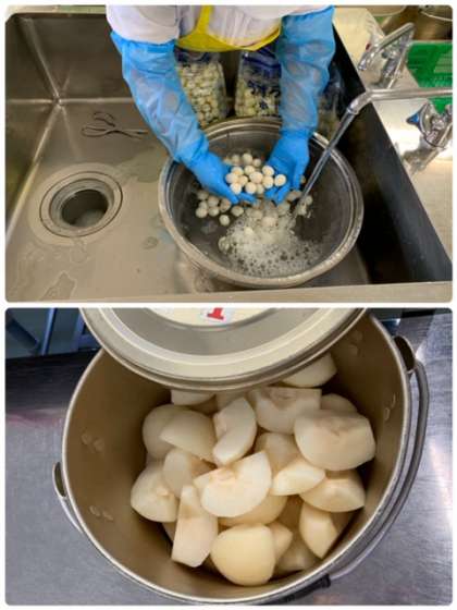前回同様、調理員さんが約700人分のなしを、1つ1つ手作業で芯を取り除き皮をむいてくれました。(写真1番下)