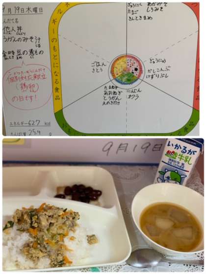 今日の給食は、『他人丼、とうがんのみそ汁、金時豆の煮もの、牛乳』でした。