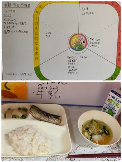 今日の給食は、『さんまのさんしょう焼き、すまし汁、高野どうふの煮もの、ごはん、牛乳』でした。