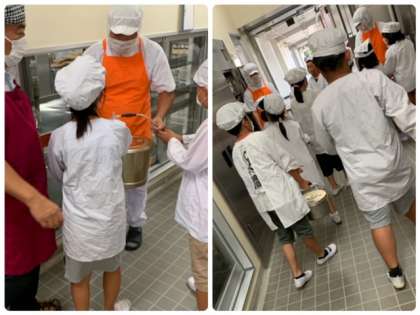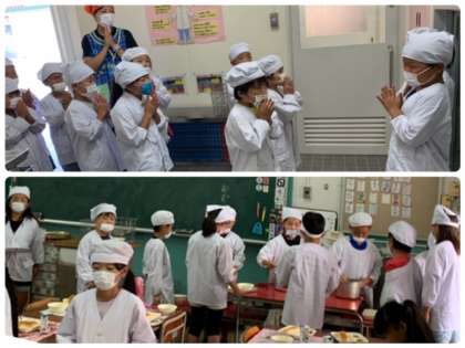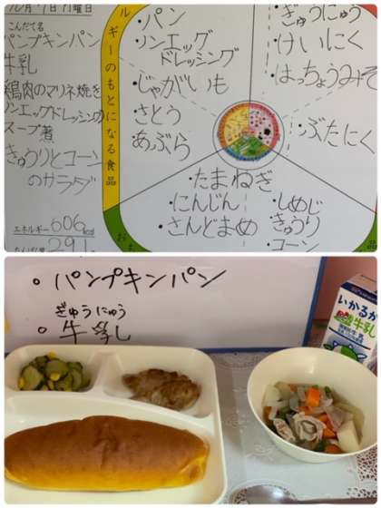 今日の給食は、『鶏肉のみそマリネ焼き、スープ煮、きゅうりとコーンのサラダ、パンプキンパン、牛乳』でした。