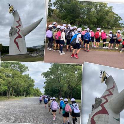初めて間近で太陽の塔を見た児童も多く、「太陽の塔の顔って横から見たらあんなとんがってるんだ」「中どうなってるんだろう」「大きいなー」など、それぞれが何か感じ取っている様子でした。