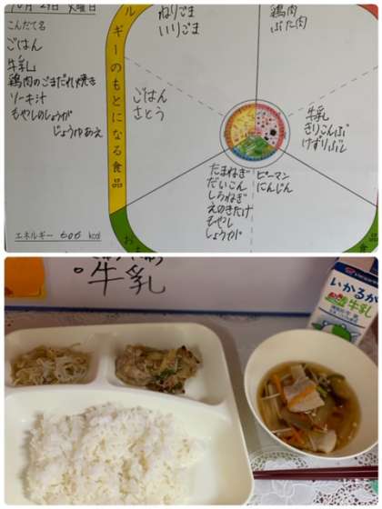 10月29日の献立は、『鶏肉のごまだれ焼き、ソーキ汁、もやしのしょうがじょうゆあえ、ごはん、牛乳』でした。