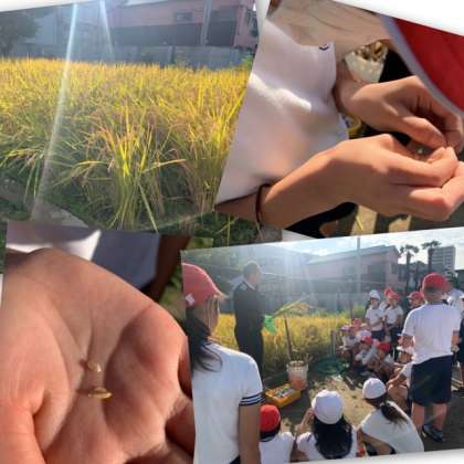 お家でも実際にお米を育てていらっしゃる校長先生ご指導の下、稲の穂を観察したあと、カマを使って稲刈りを行いました。