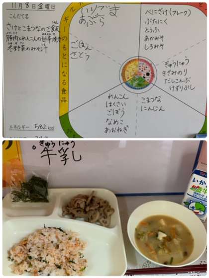 11月8日の献立は、『さけとこまつなのご飯、豚肉とれんこんの甘辛焼き、冬野菜のみそ汁、牛乳』でした。