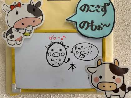 給食委員会の担当クラスは5年3組のだったのですが、牛乳のホワイトボードに「やったー!0だー!」というセリフと共に可愛いイラストを書いていました!!