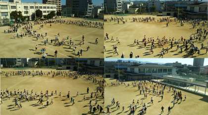 始めの一周はクラスで列に並んで走り、2周目以降は各自のペースで走ります。
