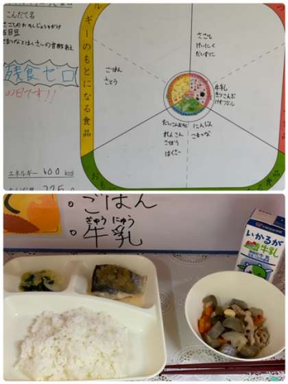 今日の給食は、『さごしのおろしじょうゆかけ、五目豆、こまつなとはくさいの甘酢あえ、ごはん、牛乳』でした。