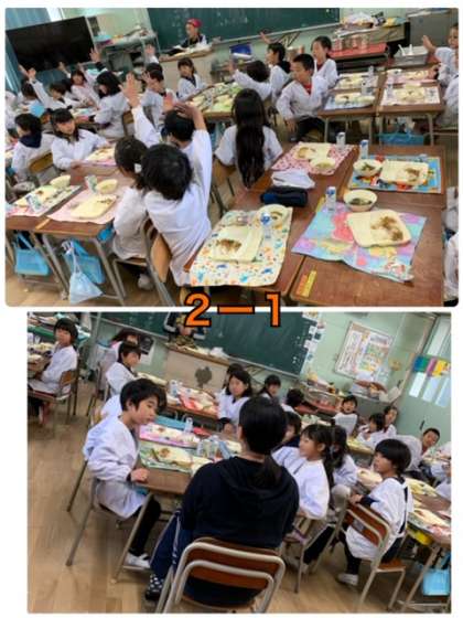 この日は、2−1、2−2に調理員さんをお招きしての交流給食でした。