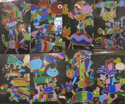 一年生では、ブレーメンの音楽隊の絵とふしぎなぼうしを作成しました。