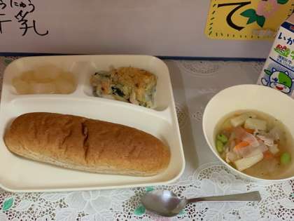 今日の給食は、『マカロニグラタン、だいこんのスープ、和なし(カット缶)、ライ麦パン、牛乳』でした。