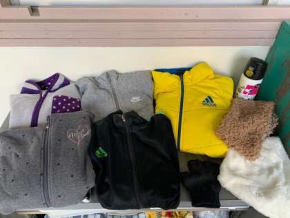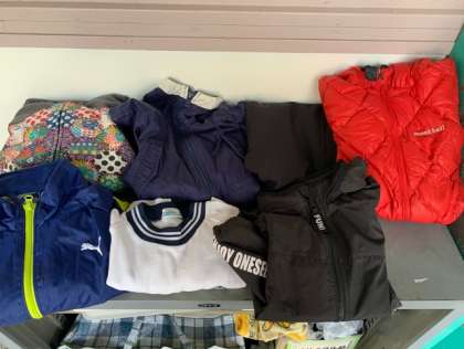 体操服やマフラー、ハンカチ、まだ新品のアウターなど、たくさんの落とし物が届いています。