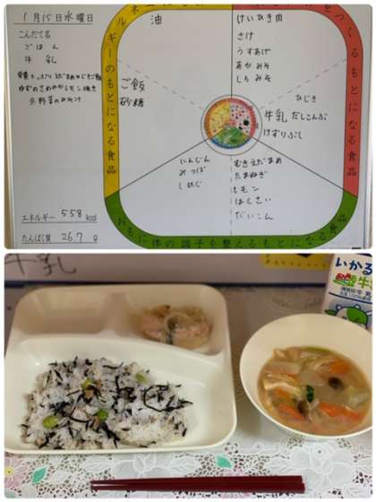 1月15日の給食は、『栄養たっぷりえだまめひじきご飯、さけのさわやかレモン焼き、冬野菜のみそ汁、ごはん、牛乳』です。