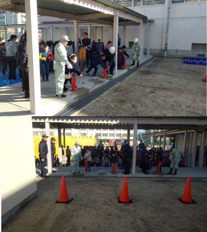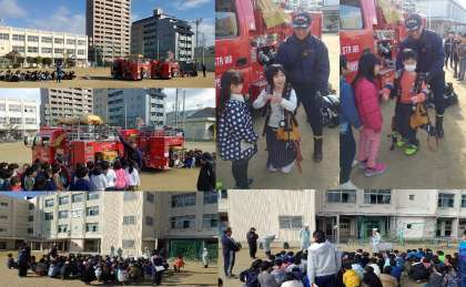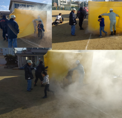 1年生から4年生は、2時間目と3時間目に煙体験や水消火器体験したり、消防車や学校備蓄品の説明を受けたりしました。