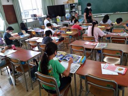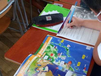 地図帳や教科書を使って、調べ学習をしています。