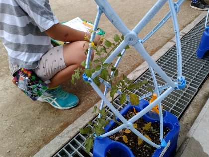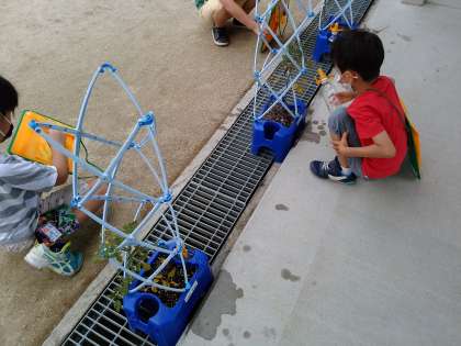 2年生が、ミニトマトを育てています。小さな緑色の実がつき始めています。子どもたちも一生懸命観察していました。