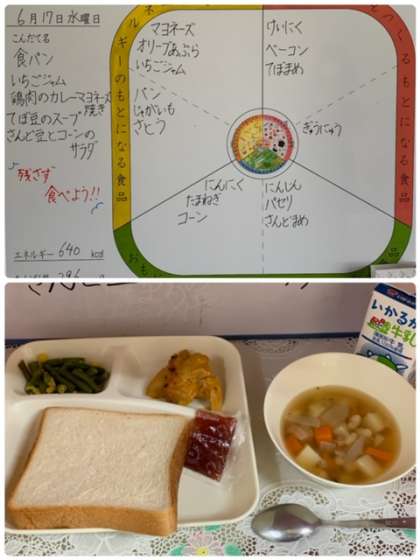 今日の給食は、『鶏肉のカレーマヨネーズ焼き、てぼ豆のスープ、さんどまめとコーンのサラダ、食パン、いちごジャム、牛乳』でした。