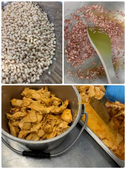 にんにく・塩・カレー粉・粗挽こしょう・マヨネーズ・ケチャップで下味をつけた鶏肉を、スチームコンベクションオーブンで蒸し焼きにした献立です。