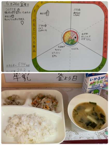 今日の給食は、『豚肉と野菜のいためもの、みそ汁、キャベツの赤じそあえ、ごはん、牛乳』でした。
