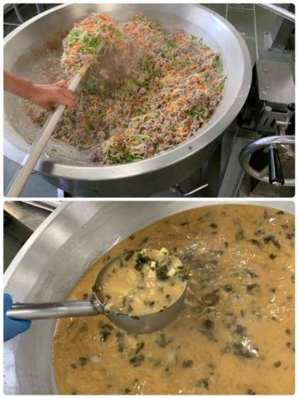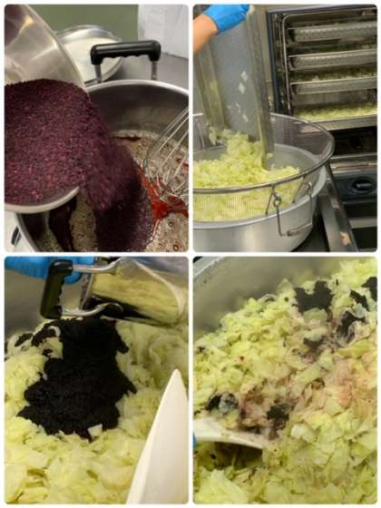 スチームコンベクションオーブンで蒸したキャベツを、乾燥の赤じそを加えて作ったタレと和えた献立です。