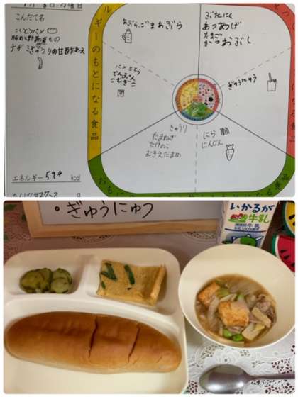 今日の給食は、『豚肉と野菜の煮もの、チヂミ、きゅうりの甘酢あえ、黒糖パン、牛乳』でした。