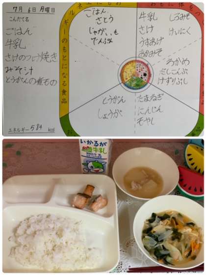 今日の給食は、『さけのつけ焼き、みそ汁、とうがんの煮もの、ごはん、牛乳』でした。