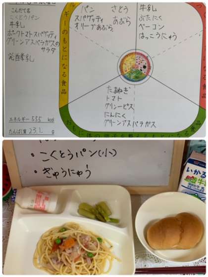 今日の給食は、『ポークトマトスパゲッティ、グリーンアスパラガスのサラダ、発酵乳、黒糖パン(小)、牛乳』でした。
