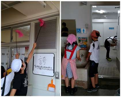 家庭科で清掃について学習し、自分たちで計画を立てて清掃に取り組んでいるところです。「はたきなんて初めて使った!」という声も聞かれました。