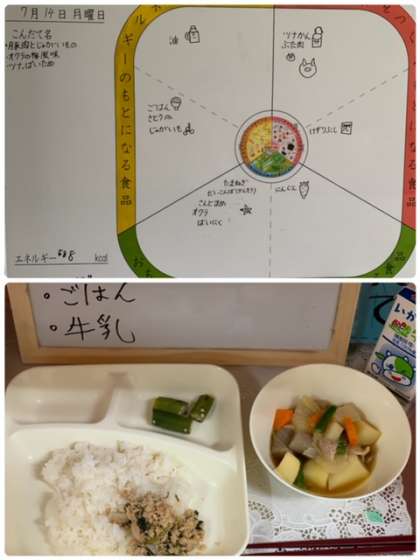 今日の給食は、『豚肉とじゃがいもの煮もの、オクラの梅風味、ツナっ葉いため、ごはん、牛乳』でした。