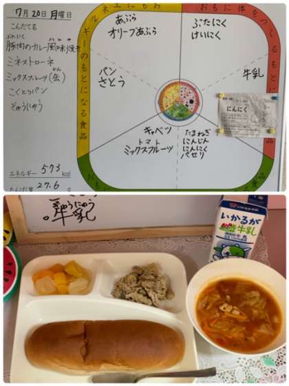 今日の給食は、『豚肉のカレー風味焼き、ミネストローネ、ミックスフルーツ(缶)、黒糖パン、牛乳』でした。