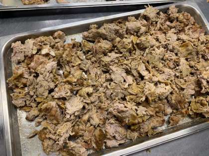 豚肉に、ワイン・塩・粗挽きこしょう・カレー粉・綿実油で下味をつけて、スチームコンベクションオーブンで風味良く焼いたものです。